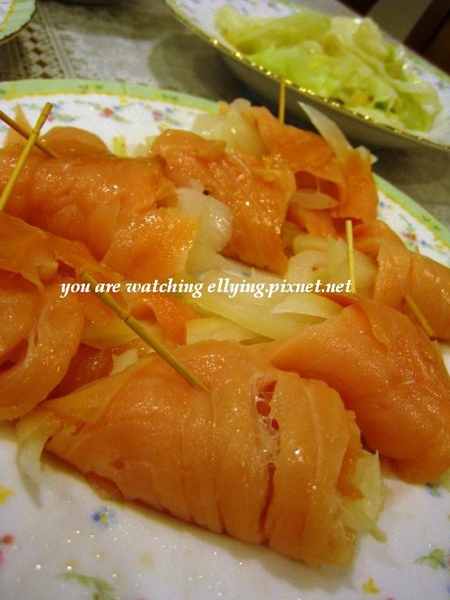 新菜色1: 洋蔥燻鮭捲(COSTCO燻鮭魚配上川燙過的洋蔥絲真夠讚!!)~屋賣伊!!~