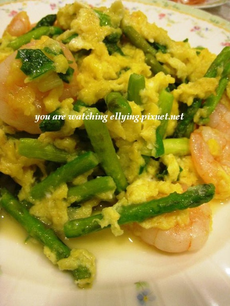 新菜色2:滑蛋蘆筍蝦仁(第一次做因為火太大結果蛋沒有滑的感覺,口味戶長喜歡但我覺得淡了點)