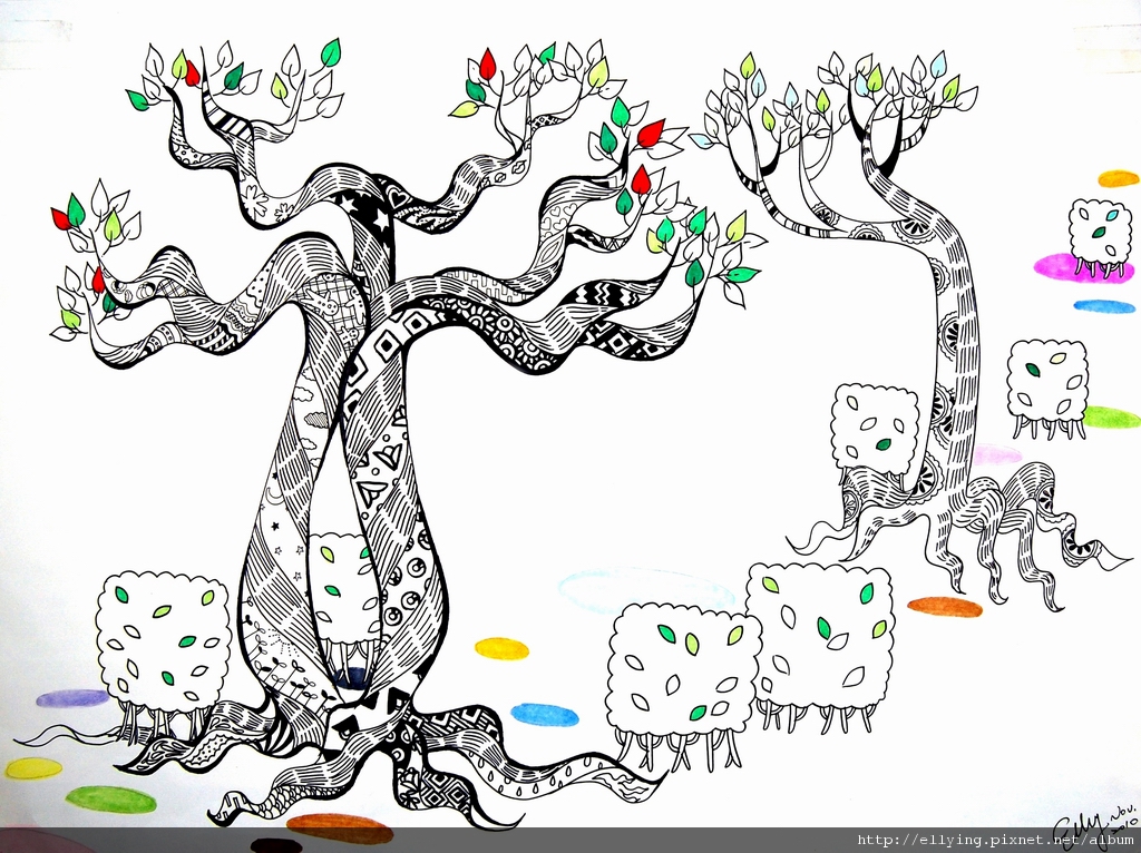 設計素描課結束了,畫好的作業之一: 跳舞的樹~ 經過魚的進化,這些樹幹的花紋就沒那麼難了~