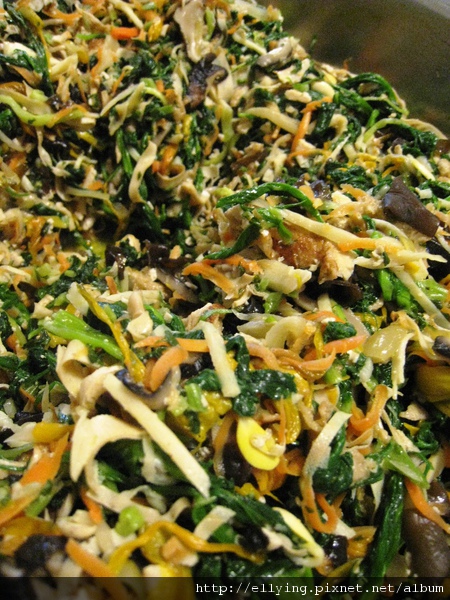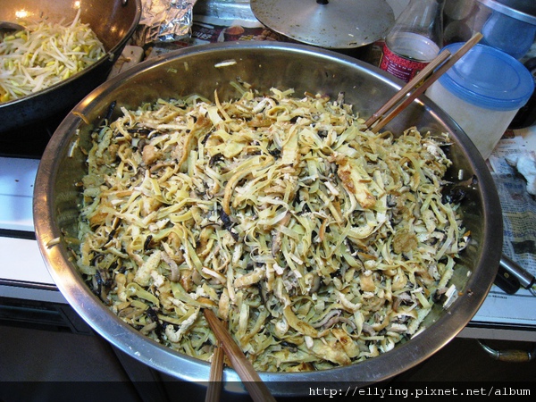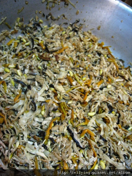 一開始是各種豆類菜切絲炒過拌在一起,然後一起用香菇水烹煮入味。