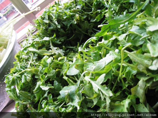 接下來就是把綠色菜類加入,其中一種是過年期間才會有的菜叫薺菜,據說以前在大陸是冬天時長在城牆上。